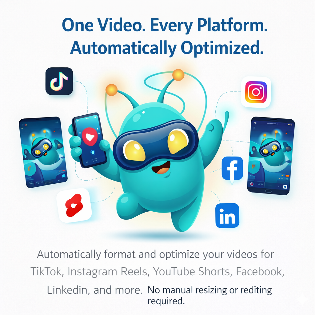 Automatically format and optimize your videos for TikTok, Instagram Reels, YouTube Shorts, Facebook, LinkedIn, and more. No manual resizing or re-editing required.